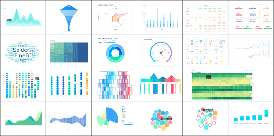 FineBI는 50가지 이상의 시각화 차트(바 차트, 라인 차트, 파이 차트, 히트맵, 지도 등)를 제공해요.