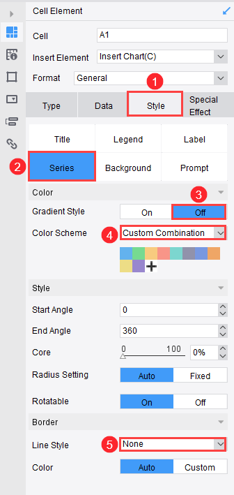 4. Style > Series를 선택하고 파이 차트의 Color Scheme을 설정한 후, Border의 Line Style에서 None을 선택합니다. 아래 그림을 참조하세요.