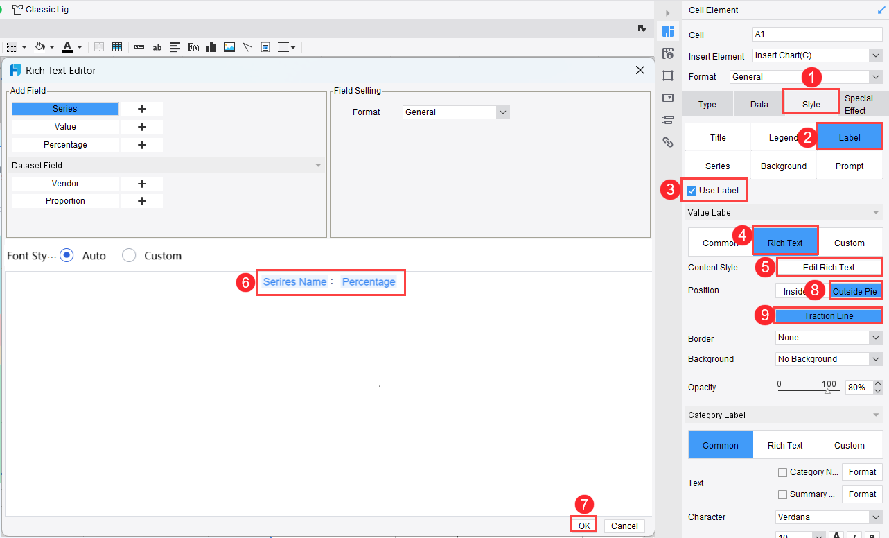 3. 파이 차트에 Value Label과 Category Label을 설정할 수 있습니다. 이 예시에서는 데이터 > Category에서 카테고리가 None으로 설정되어 있으므로 Value Label만 설정하면 됩니다. Style > Label을 선택하고 Use Label을 선택한 후, Value Label에서 Rich Text를 선택합니다. 위치는 Outside Pie로 설정하고 Traction Line을 선택합니다. 아래 그림에서 이 단계를 확인할 수 있습니다.