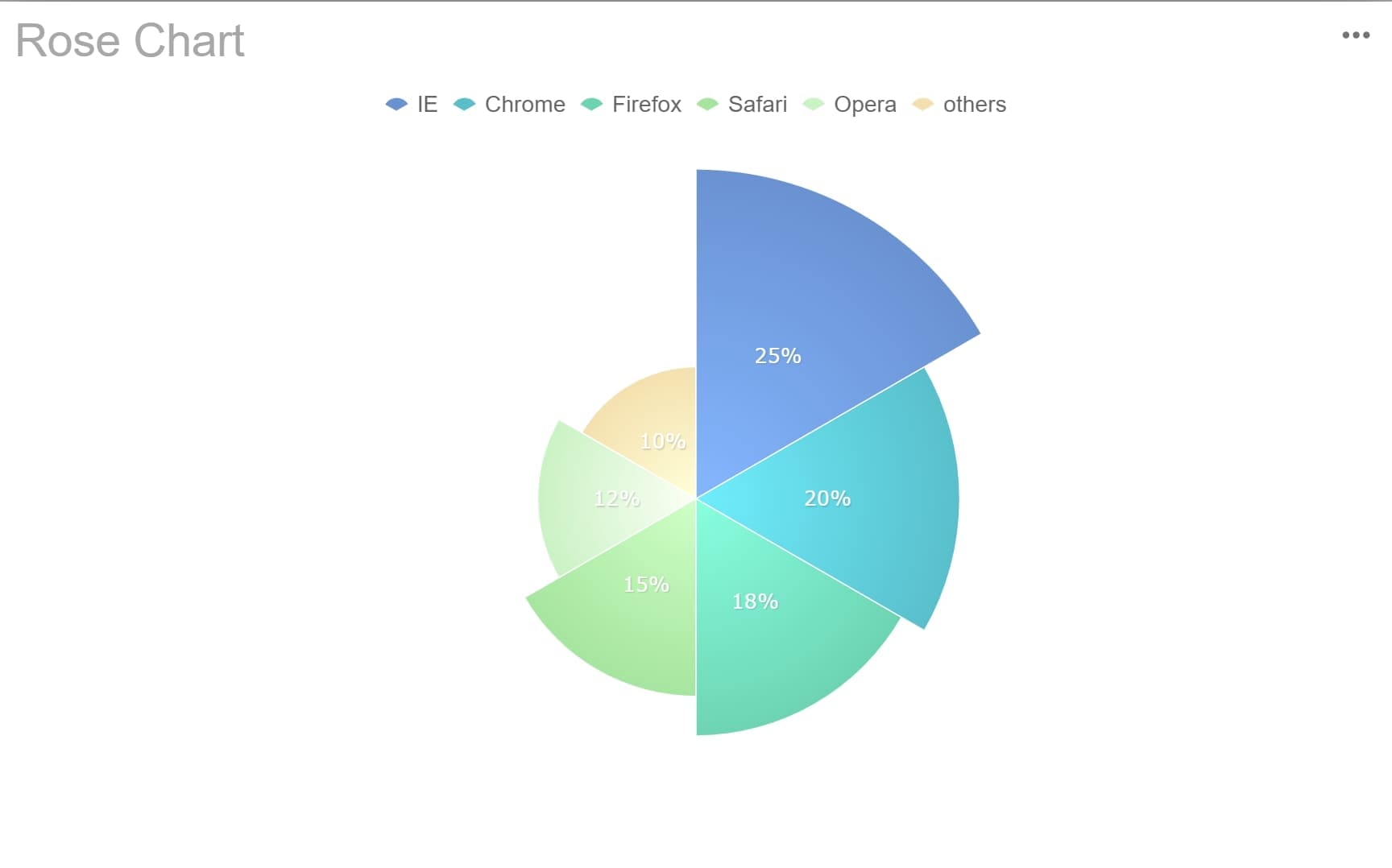 로즈 차트는 파이차트와 비슷하지만, 각 조각의 반지름 길이로 값을 나타냅니다. 각 항목은 중심에서 바깥쪽으로 뻗으며, 각도와 길이 모두 데이터의 크기를 반영합니다. 주기적이거나 반복적인 데이터, 예를 들어 계절별 판매량이나 시간대별 방문자 수를 시각화할 때 자주 활용됩니다.
