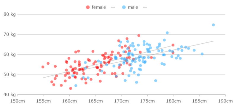 파란색 점은 여성, 녹색 점은 남성을 나타내며, 점의 분포 상황을 통해 남성과 여성의 키와 몸무게 분포를 알 수 있습니다.
